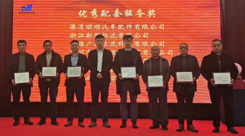 會上,副董事長宣成向2019年度優秀供應商和獲得優秀配套服務獎的企業代表頒獎,并合影留念。優秀供應商代表,浙江廣匯金屬材料有限公司總經理沈永躍上臺作了熱情洋溢的發言。優秀配套服務獎代表德清麗順汽車配件有限公司總經理趙國民上臺作了熱情洋溢的發言。