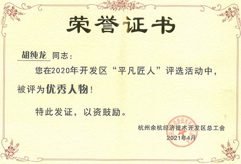 繽紛四月,東華鏈條集團傳動鏈事業部員工胡純龍被余杭經濟技術開發區總工會授予2020年“平凡匠人”稱號,這又是一次對他在平凡崗位上做出不平凡工作的認可!
