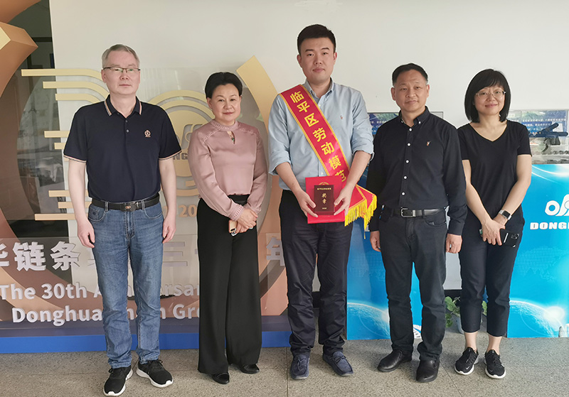 5月7日下午,臨平區人大常委會副主任、區總工會主席徐紅崗,臨平國家級經濟技術開發區黨工委委員、管委會副主任蔣葉華一行專程到東華,與宣成董事長進行座談,向宣成董事長頒發區勞動模范證書和獎章。