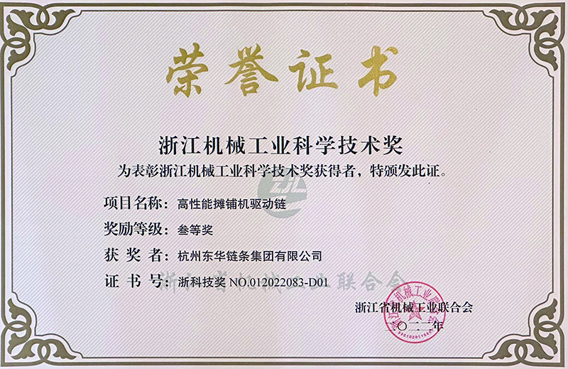 4月27日,浙江省機械工業聯合會召開會員大會,會上隆重表彰了2022年度浙江機械工業科學技術獎。東華鏈條集團自主研發的“高性能攤鋪機驅動鏈”產品獲評三等獎,這是2022年全省機械行業科技創新成果中僅有的兩項高端鏈傳動產品及制造裝備獲獎項目之一,也是東華產品創新項目連續十一年獲評浙江機械科技獎。