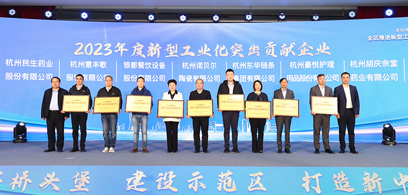 會上,東華鏈條獲得“2023年度新型工業化突出貢獻企業”、“2023年度數實融合示范企業”稱號。集團董事長宣成參加會議并上臺(右五)領獎。