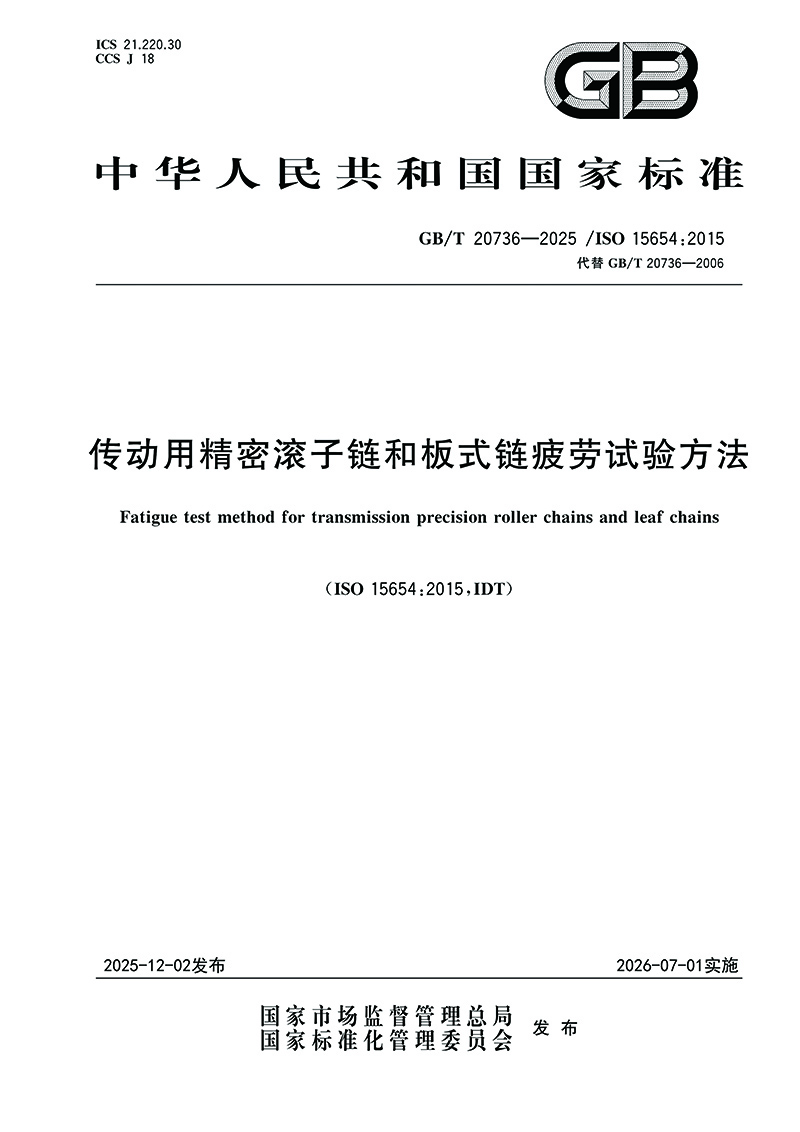 近日,國家市場監(jiān)督管理總局和國家標(biāo)準(zhǔn)化管理委員會(huì)聯(lián)合發(fā)布了261項(xiàng)推薦性國家標(biāo)準(zhǔn)。其中,由全國鏈傳動(dòng)標(biāo)準(zhǔn)化技術(shù)委員會(huì)歸口、東華鏈條集團(tuán)負(fù)責(zé)及參與研制/修訂的兩項(xiàng)新版鏈傳動(dòng)國家標(biāo)準(zhǔn)正式獲批,分別為GB/T 20736—2025《傳動(dòng)用精密滾子鏈和板式鏈疲勞試驗(yàn)方法》和GB/T 6074—2025《板式鏈、連接環(huán)和槽輪 尺寸、測量力、抗拉載荷和動(dòng)載載荷》。兩項(xiàng)新標(biāo)準(zhǔn)將于2026年7月1日起實(shí)施。